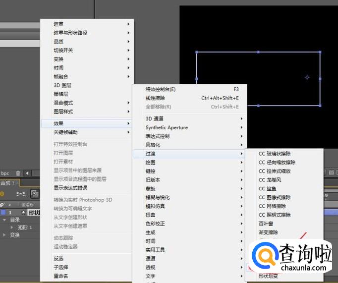 选择形状图层,右击图层依次执行:“效果>过渡>线型擦除”命令,为形状层添加特效。