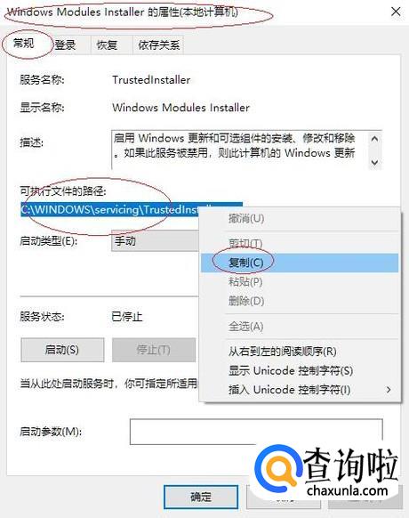 如图所示,唤出"Windows Modules Installer的属性"对话框。鼠标右击"常规→可执行文件的路径"字符串,弹出快捷菜单选择"复制"项。