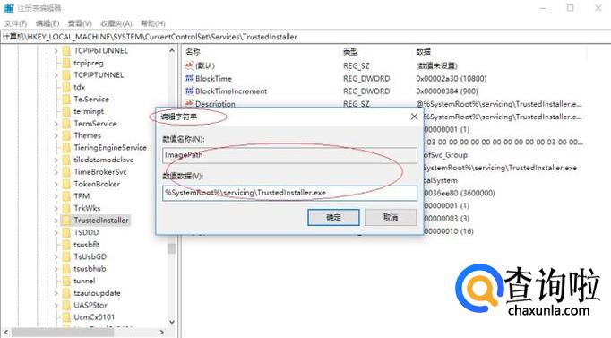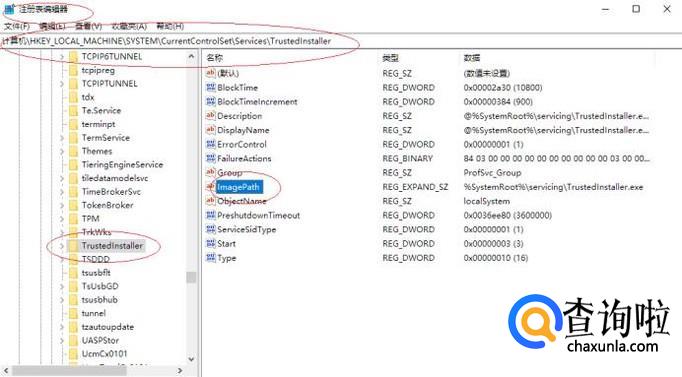 唤出"注册表编辑器"程序窗口,如图所示。展开左侧"HKEY_LOCAL_MACHINESYSTEMCurrentControlSetservicesTrustedInstaller"树形目录,鼠标双击右侧"ImagePath"键值。