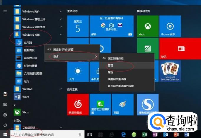 如图所示,展开"Windows 系统"文件夹。鼠标右击"此电脑"项。点击"更多→管理"项。