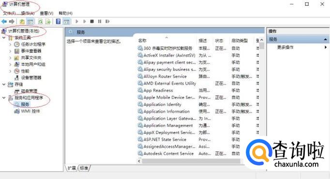 如图所示,展开"服务和应用程序"文件夹。选择"服务"项,用于启动、终止并设置Windows服务。