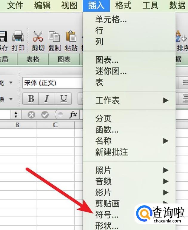 我们先点击菜单栏上的‘插入’,然后在子菜单上点击‘符号’。