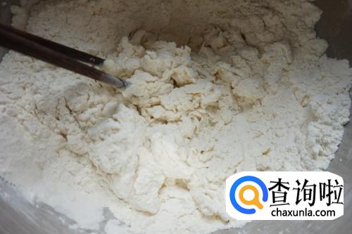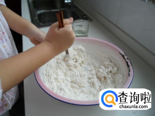 倒入酵母水时,用筷子不停的搅拌,形成小粒的块状物。
