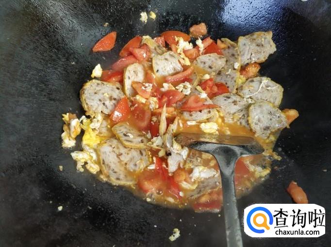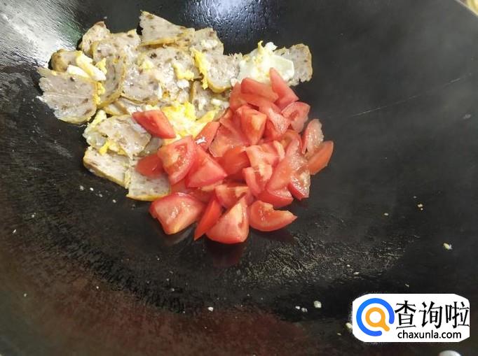 待鸡蛋和肉卷炒至8成熟时,放入切好的西红柿,与肉卷片、鸡蛋一起不断翻炒。