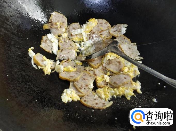 然后放入切好的肉卷片,与鸡蛋一起不断翻炒。
