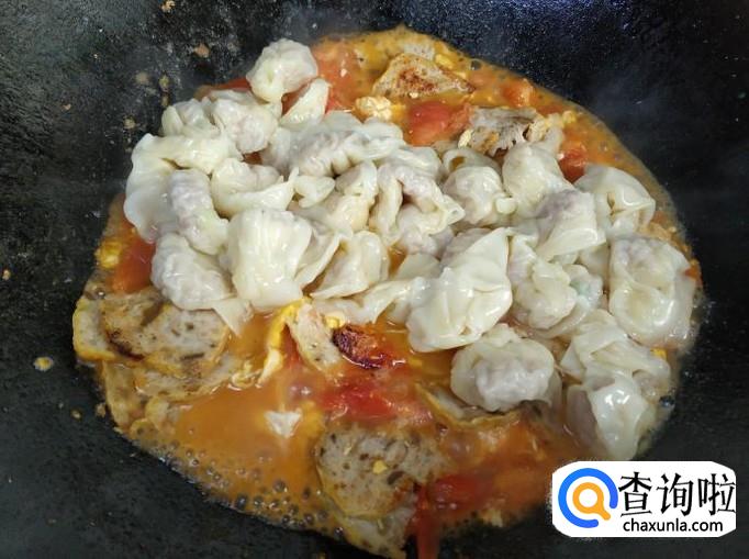 将之前过了冷水的馄饨放入锅中,与肉卷片、鸡蛋、西红柿一起焖煮。