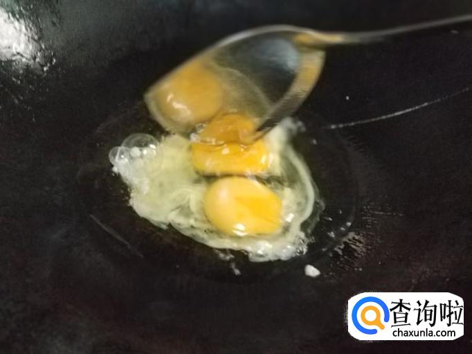在锅里放入适量的油,油热后,往锅里打入2个鸡蛋,不断翻炒。