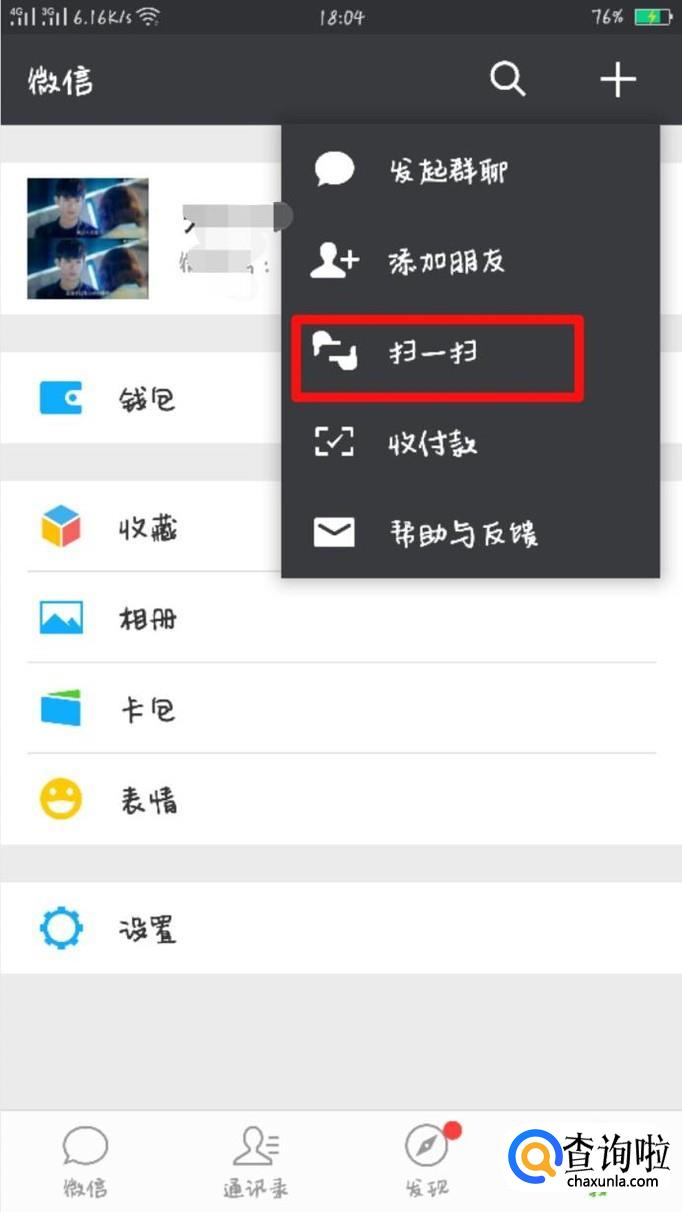 然后会出现四个选项,点击小编框起的选项“扫一扫”。