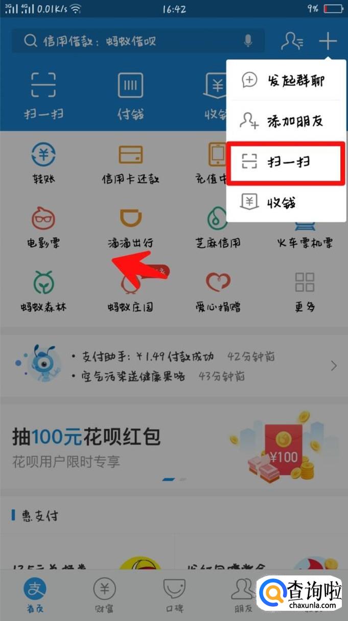 进入支付宝,点击右上角的“+”符号。