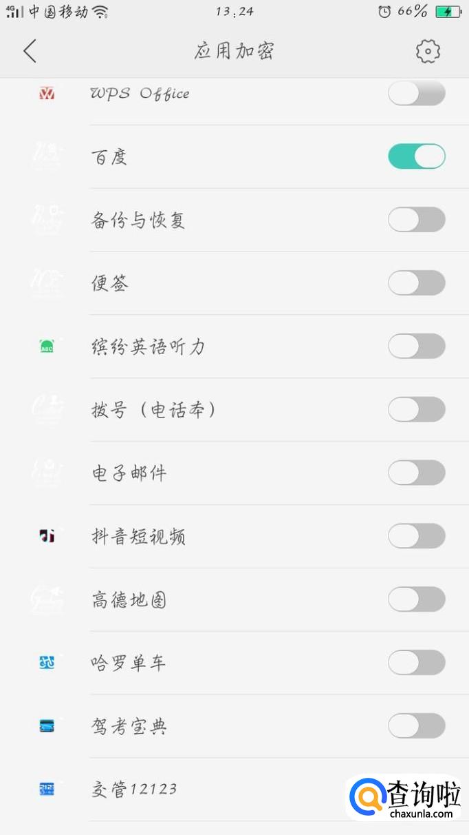 最后,在应用加密中会有许多应用软件,点击左边的开关按钮 即可打开应用加密,进入该应用就需要输入密码。