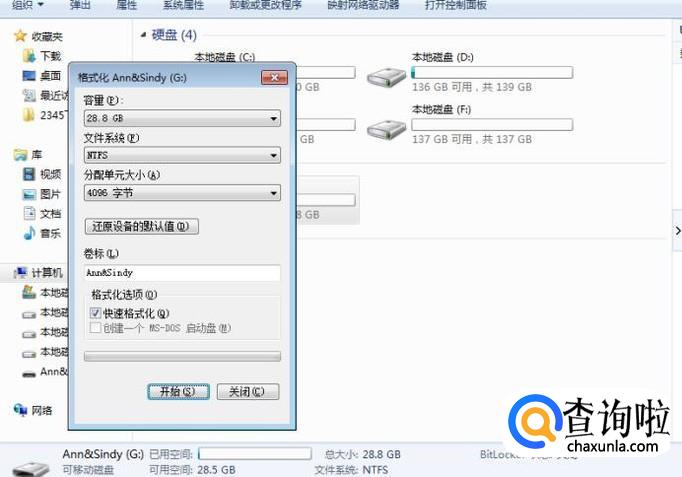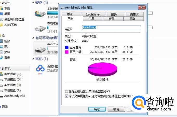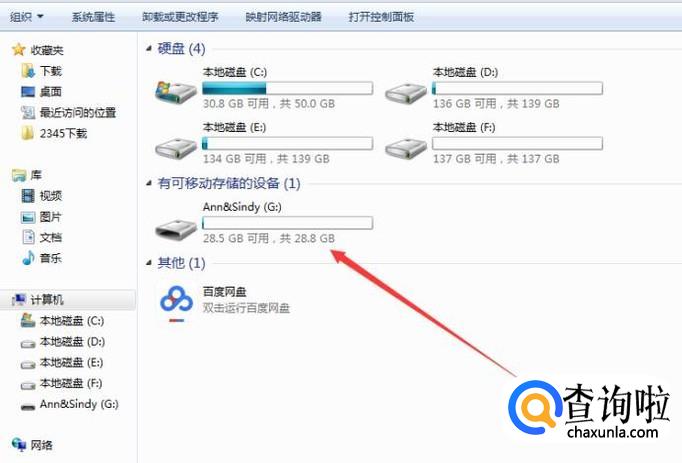 等到U盘完全被电脑读取成功后,这个时候,我们打开“我的电脑”,找到这个U盘。看到了,这个U盘下面的信息写着——28.8G。(比标注的32G少了差不多4G)