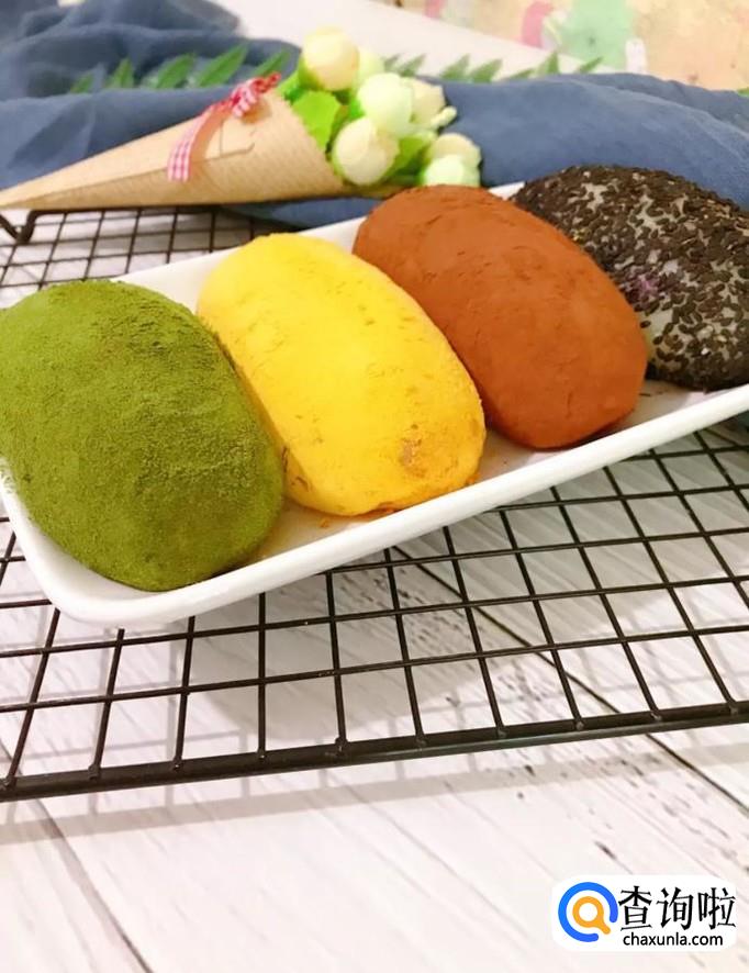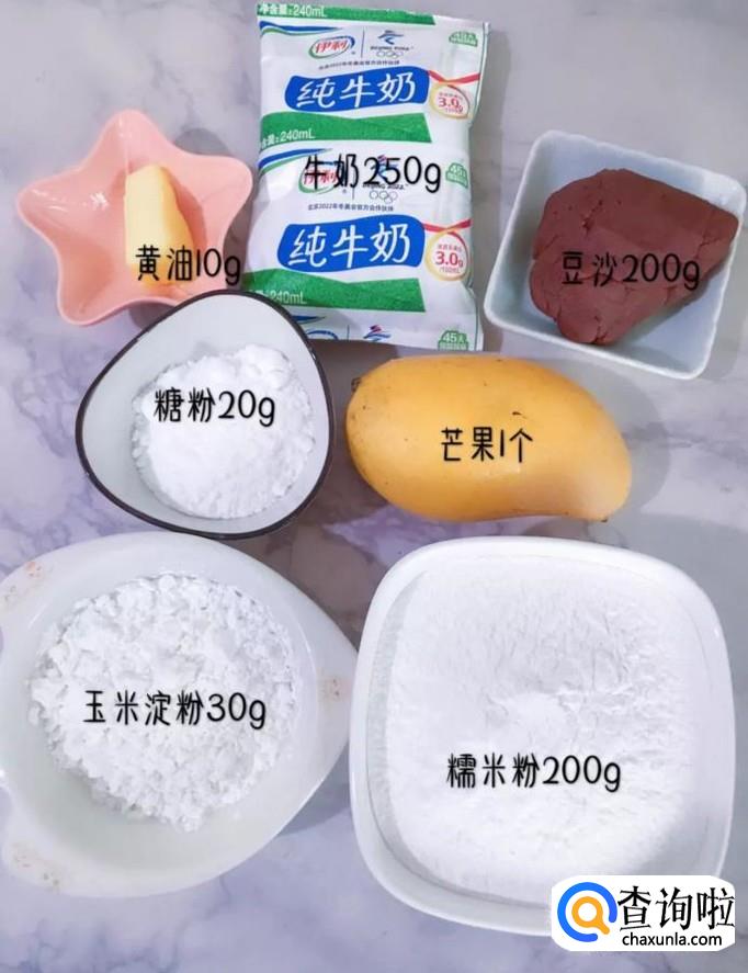 食材:黄油10g,糖粉20克,玉米淀粉30克,牛奶250克,芒果一个,豆沙200克,糯米粉200克。