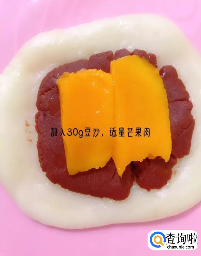 然后把面团用擀面杖擀成我们想要的薄饼形状,并加入豆沙和芒果肉,如下图所示。