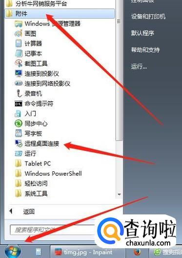 然后我们点击左下角“开始”图标,在“所有程序”里面找到“附件”的文件夹,展开后我们点击“远程桌面连接”,然后会弹出远程窗口,我们按照图片中箭头操作就可以远程连接了。