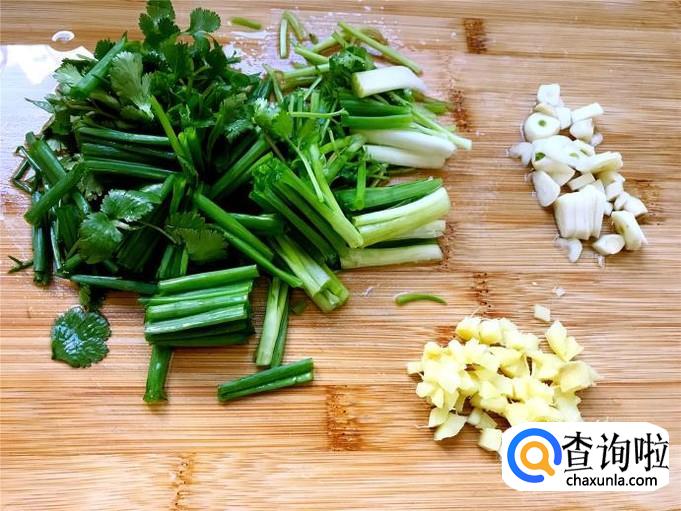 准备好辅料:小葱、香菜、姜和蒜,如下图。