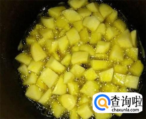 锅里倒入半锅油,油烧到七成热后,倒入排骨炸几分钟,把排骨炸到金黄色,捞起来备用。然后再放入土豆,炸到金黄色,捞起来备用。