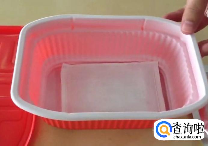 把里面有的发热用水包倒入刚才放入加热包的外盒里面,然后再把米饭放在加热包上面。