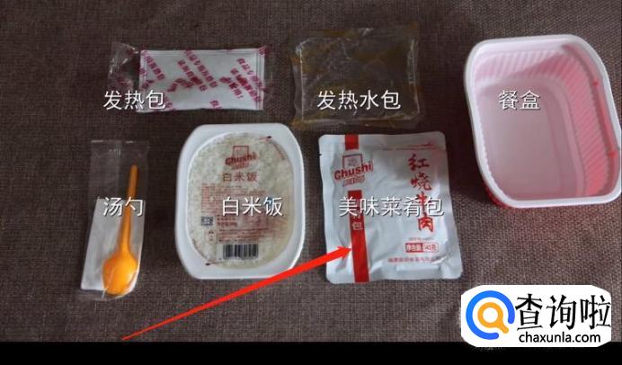 首先我们一起来看看里面到底装了些什么东西吧!米饭、菜、热菜的发热包、专用热菜水包。