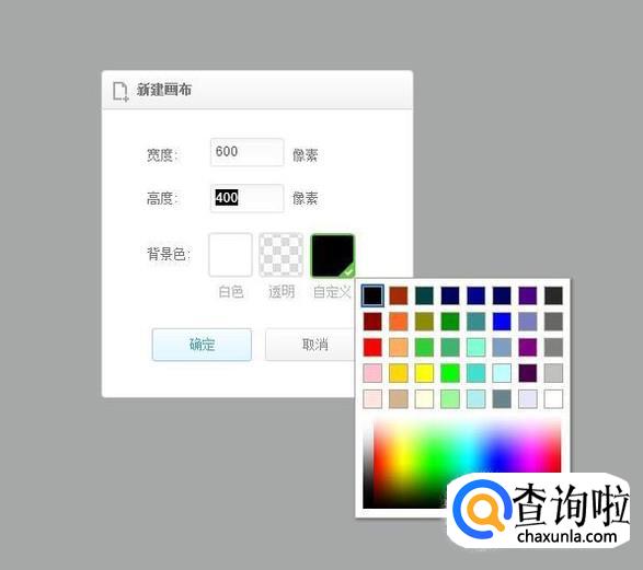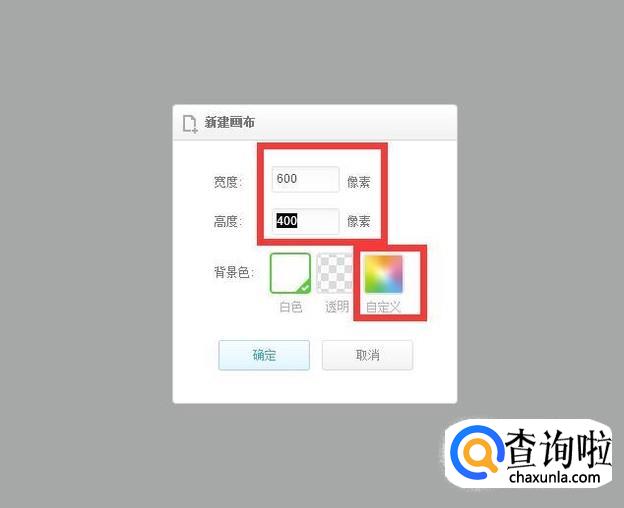然后把画布的宽度设置为600像素,高度设置为400像素,再点击自定义。