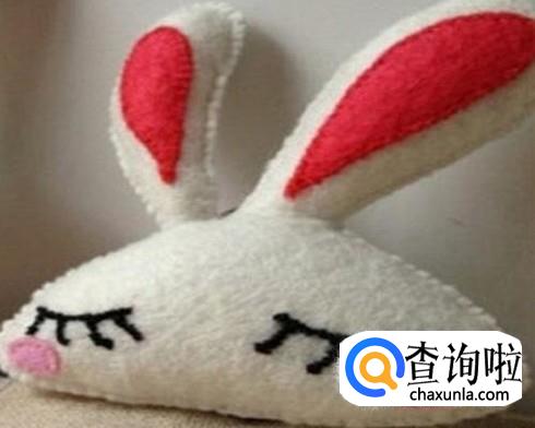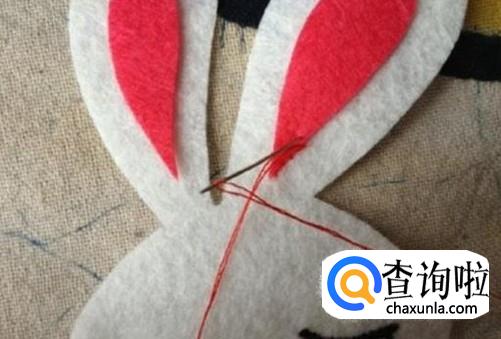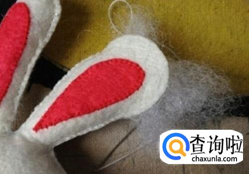 将两块兔子轮廓的不织布缝合在一起(一块是缝了眼睛、腮红、耳朵的,一块是空白的),缝到一半的时候将棉花塞进去,让兔子的身体、耳朵都鼓起来,塞完棉花再把整个兔子缝好。