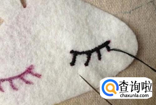 拿出一块白色小兔子整个轮廓的不织布,在不织布上用红色彩笔画上小兔子的眼睛,然后再用针线来勾勒出兔子的眼睛。