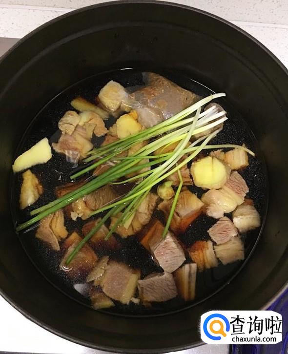 把处理好的牛肉放入珐琅锅,锅中依次加入1小勺料酒以及适量姜片、香叶和1个干辣椒,如果喜欢吃辣的,可以适量多加一些干辣椒。再加入1勺红烧酱油、生抽和白糖,然后加入适量水,使水面略微超过牛肉,同时把摘洗干净的香葱也放入锅中,大火煮开后转小火40分钟左右。