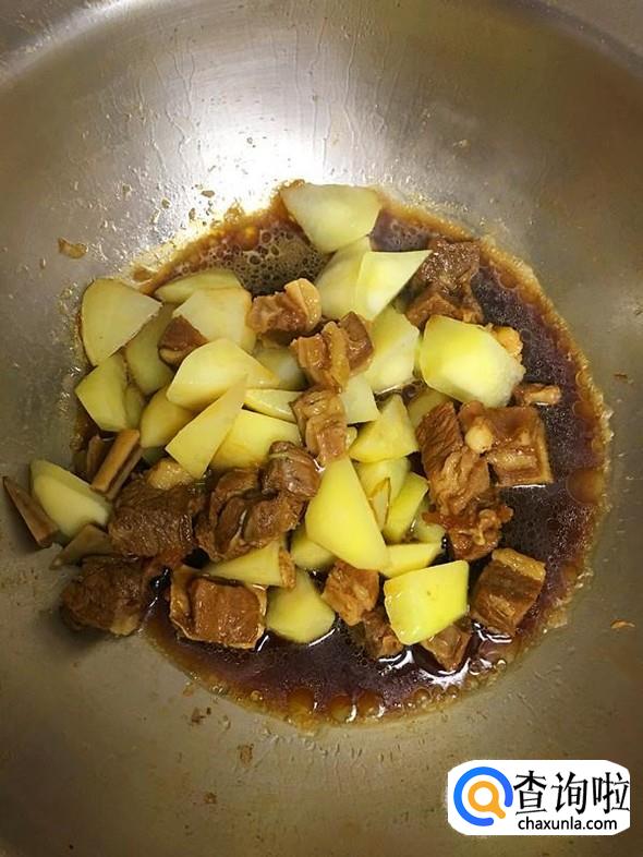 当土豆煎至淡淡的金黄色时,把煮好的牛肉连带汤水一起倒入锅中。这样操作,土豆更能吸收牛肉的味道,口感更好。