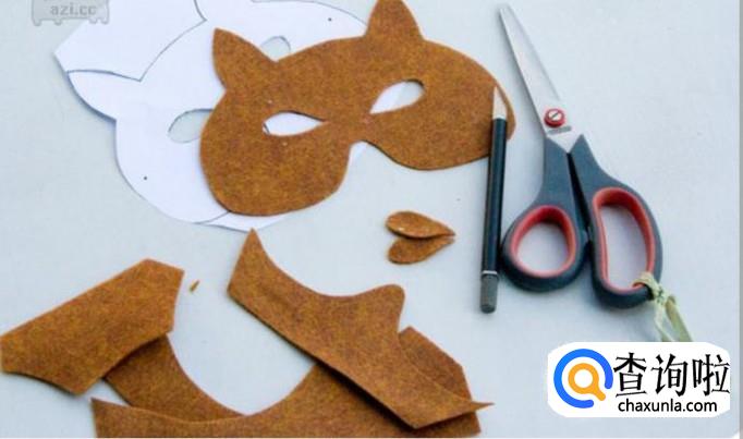 然后在狐狸脸颊两边分别用剪刀剪出小洞,然后把准备好的橡皮筋穿进去并且打好结。
