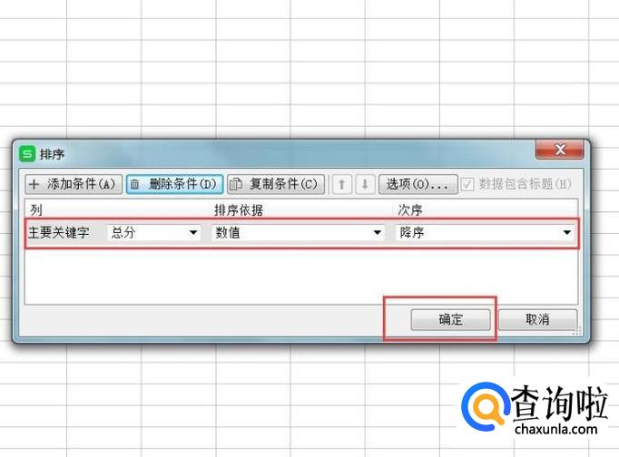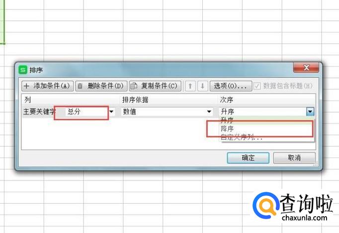 接下来,在打开的排序菜单页面中,点击选择“主要关键字为总分”,然后选择排序方式为“降序”,并点击确定按钮。