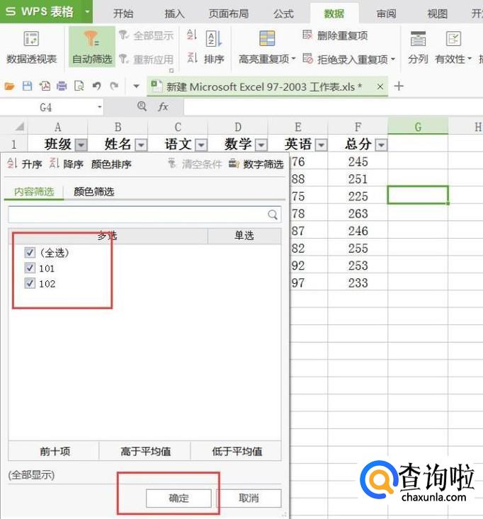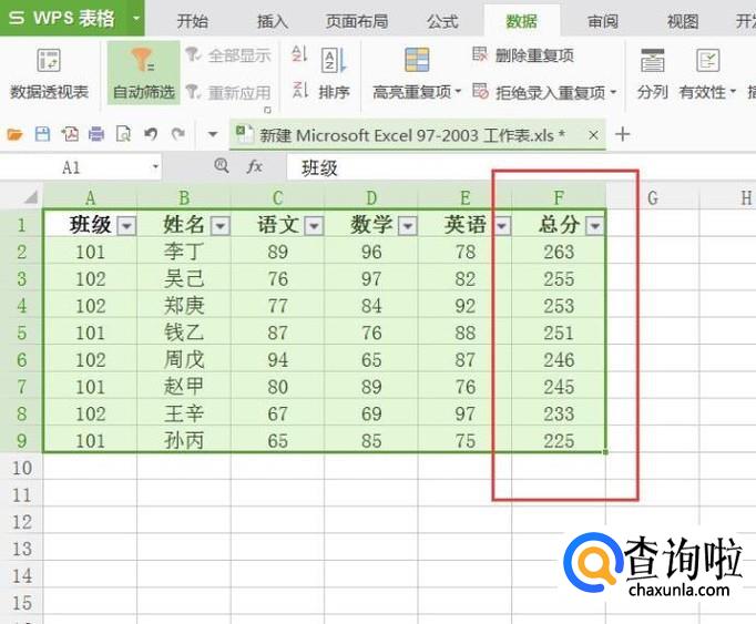 如果不想按照班级名单进行区分,那么我们可以在数据筛选项目中,勾选全部的学生名单,然后即可得到所有人的成绩表格。此时,我们还是按照之前的操作步骤,对数据进行降序排列。