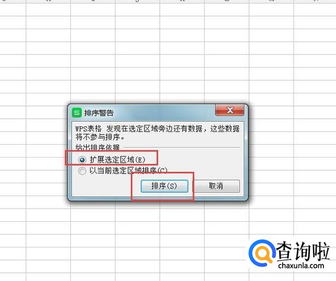 在弹出的对话框中,点击选择“拓展选定区域”按钮,并点击“排序”菜单。