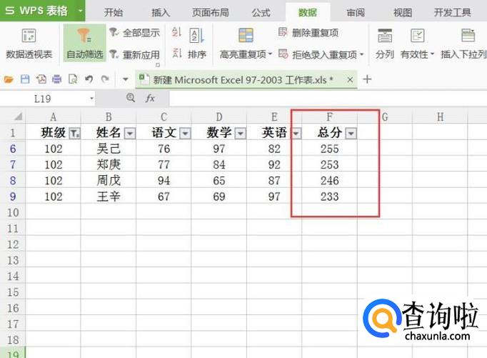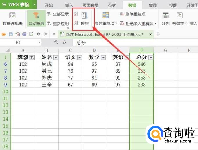 接下来,选中“总分”数据项,点击表格顶部的“数据-排序”功能按钮。