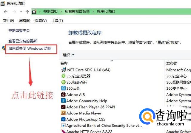 接下来会进入程序和功能界面,我们点击左侧的启用或关闭Windows功能选项,如下图所示