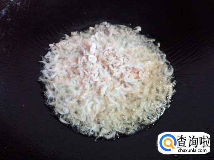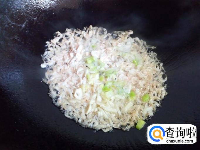 锅里放入油加热,油热后放入虾皮,小火翻炒,炒至虾皮出香味,放入葱,姜,蒜翻炒。