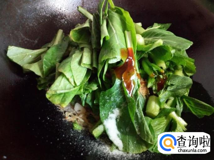 随即放入菜心转大火翻炒,放入五香粉,一匙儿蚝油,少许盐。炒至菜心断生,放入炒好的鸡蛋。
