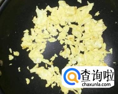 锅中放入花生油,先将鸡蛋搅拌均匀,倒入锅中,用铲子搅散成小块,炒熟后来先盛出来备用。