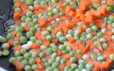 锅中再放入花生油,将胡萝卜、青豆、火腿放入锅中翻炒均匀。