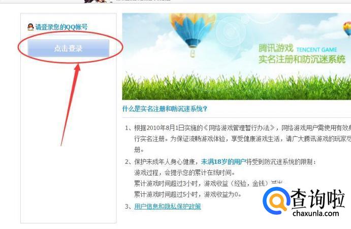 然后来到“QQ防沉迷”页面,再点击左侧的“点击登陆”。