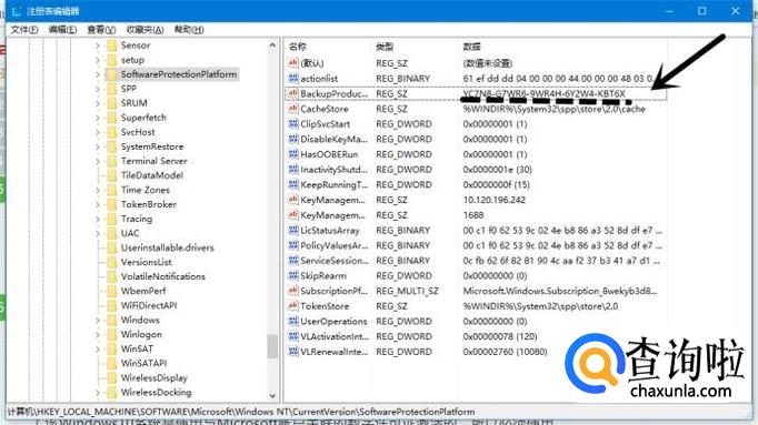 点击SoftwareProtectionPlatform后,在其右边面板中找到BackupProductKeyDefault,BackupProductKeyDefault右边的那段字母就是我们系统的激活密钥