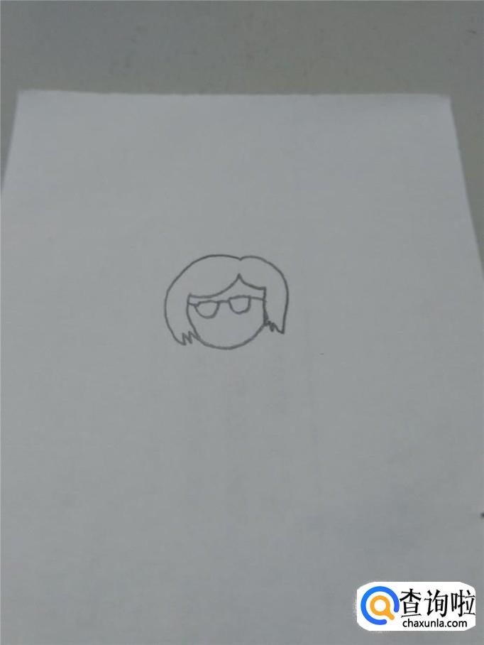 在两侧发梢之间,画一条弧线,画出脸型,在脸的上方,画出一副眼镜。
