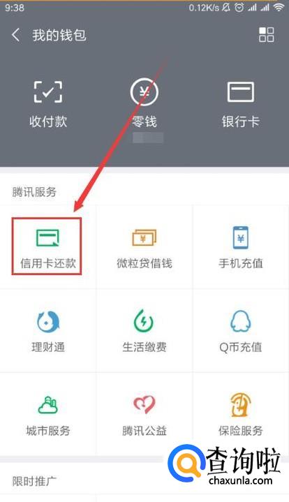 打开微信钱包,点击里面的“信用卡还款”,在还款界面选择信用卡。