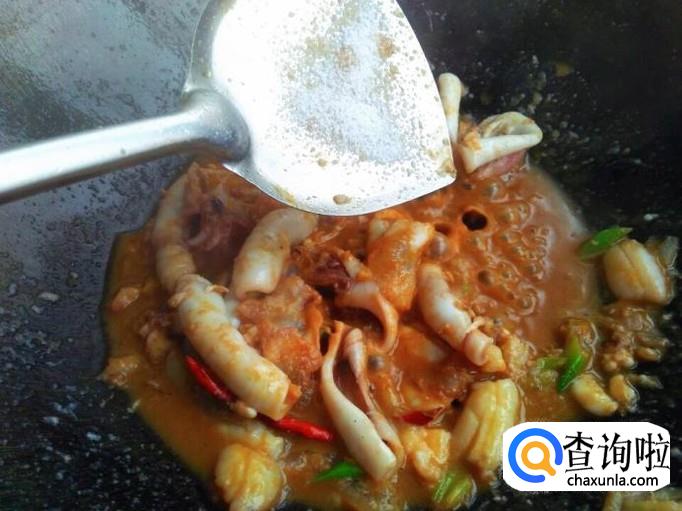 海兔炒到卷起的时候,说明海兔基本上炒熟了,加上一些食盐、生抽、白糖翻炒几下,让其入味。