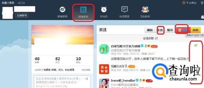 打开批量小管家,登录微博,如图所示,点击图中的“批量管家”标签,点击“全选”,然后就可以一键删除所有微博了。