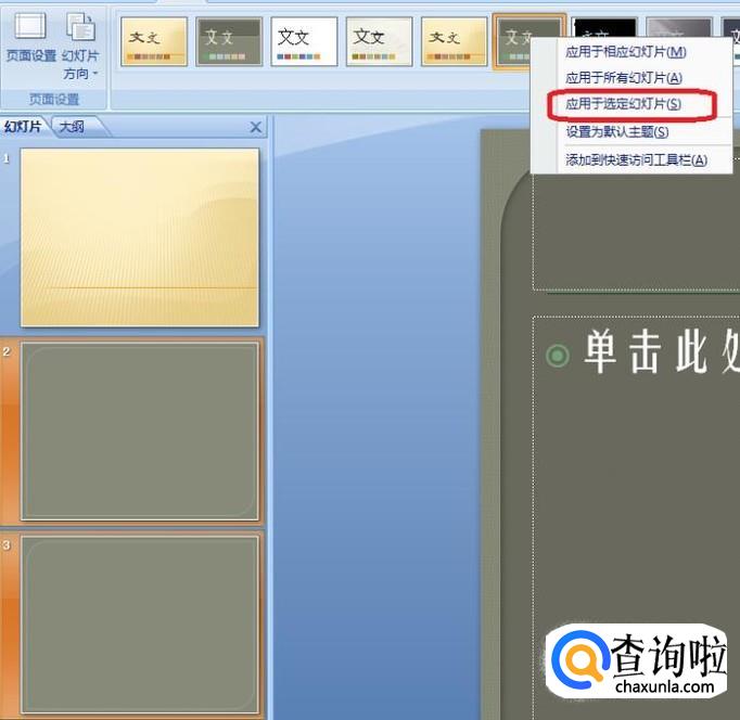 如果我们希望某些幻灯片单独用别的主题,只要按“ctrl键”,选中几张需要的幻灯片后,右键点击幻灯片主题,如图所示,选择“应用于选定的幻灯片”,就可以了。