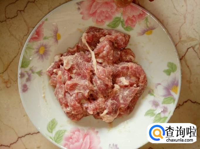 瘦肉我们选里脊肉,比较嫩比较好吃;我们将里脊肉洗净,切成小块薄片,加入少量料酒、蚝油,抓匀,腌制半小时;