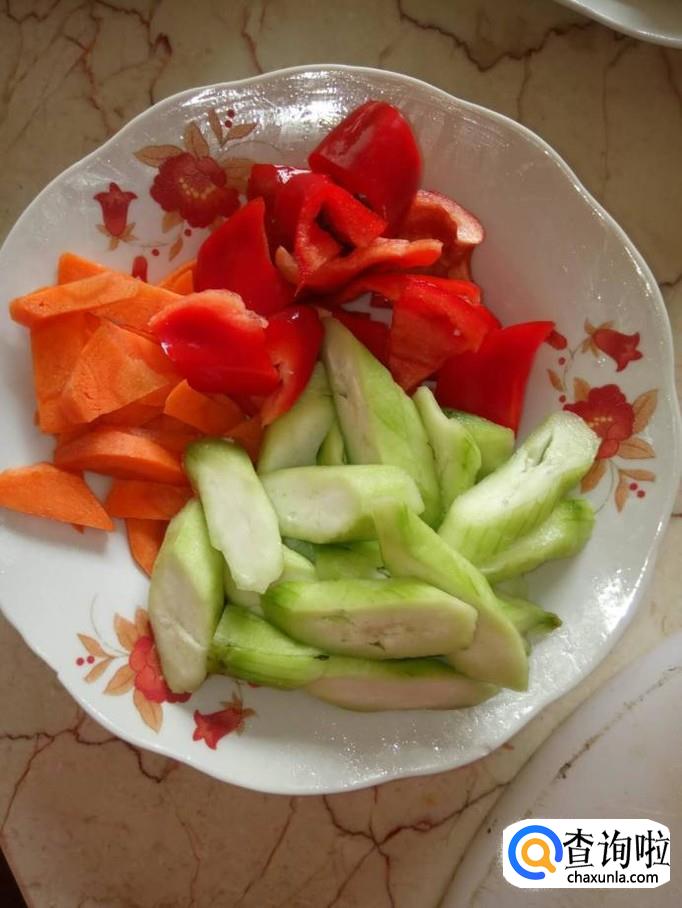 材料:瘦肉 油豆腐 胡萝卜 丝瓜 红椒 淀粉 蚝油 盐 鸡精 食用油