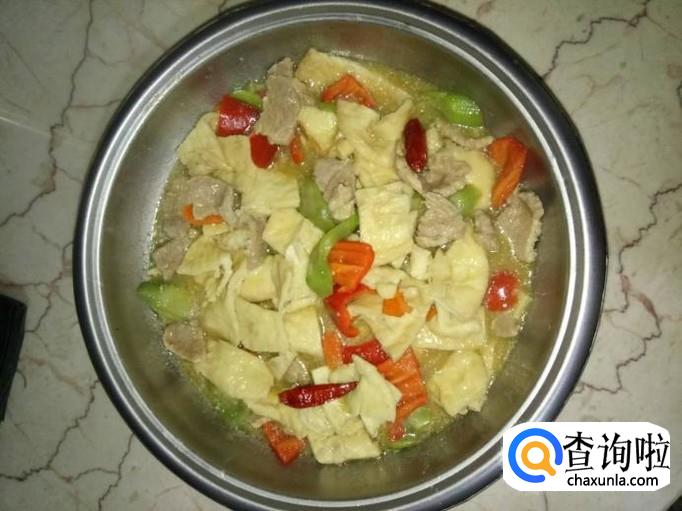 将瘦肉下入锅里,煮1-2分钟,将红椒下入锅里,再加入适量的盐和鸡精,调味好,翻炒均匀,就完成了!味道非常棒哦!