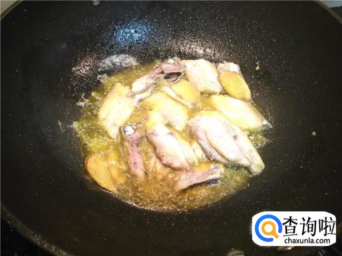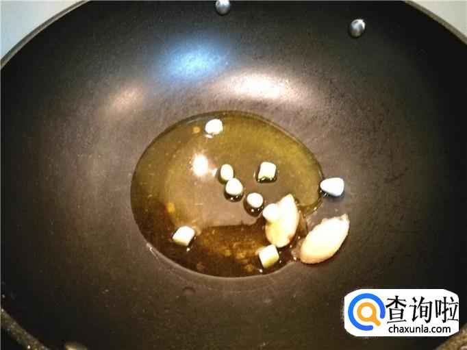 开火,锅里放入油、姜片、大蒜头根部取一点,把油烧热,把姜煎白为止。
