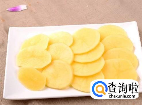 用刀将土豆切成均匀的片,将西红柿切成块状。