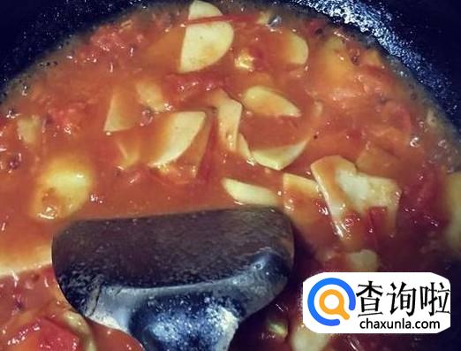 用铲子将西红柿铲碎,多炒一会,使西红柿成粥状,炒到土豆熟透,西红柿的汁包裹在土豆上面,就可以出锅了,酸甜口味,非常好吃。